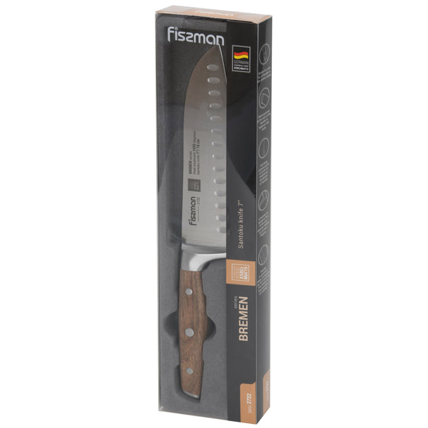 The BREMEN Santoku Knife is a multifunctional item. It is made for chopping vegetables, thin slicing and cutting fish and meat. The scalloped indentations make this knife easy to use by creating air pockets between blade and food, ensuring nothing sticks to the blade. Kitchen knives BREMEN are made of high-quality German steel X50Cr15MoV. It is strong and durable, hardened up to HRC 57 on Rockwell scale.